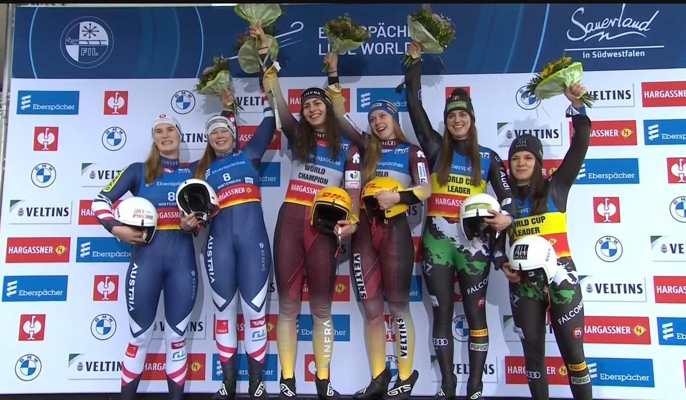 With three events to go in the women’s doubles 2022/2023 season, Vötter and Oberhofer hold a 70 point lead over Egle and Kipp. The German duo of Degenhardt and Rosenthal are 99 points out of the lead in third.