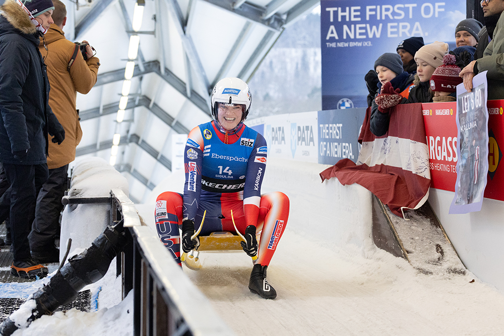 “This was a ton of fun, but I had maybe the worst reaction for a win. I didn’t think it was going to happen, and I tried really hard to not think about the results with the one run each day,” Britcher told FIL TV after the race. “You have so much time to think about possibilities. I was so shocked! I’ve had a lot of ups and downs in Sigulda, a long time ago it was my favorite track and I really loved it so this week was so much fun. The track crew did an amazing job and it was so much fun to feel that joy on the track again!”