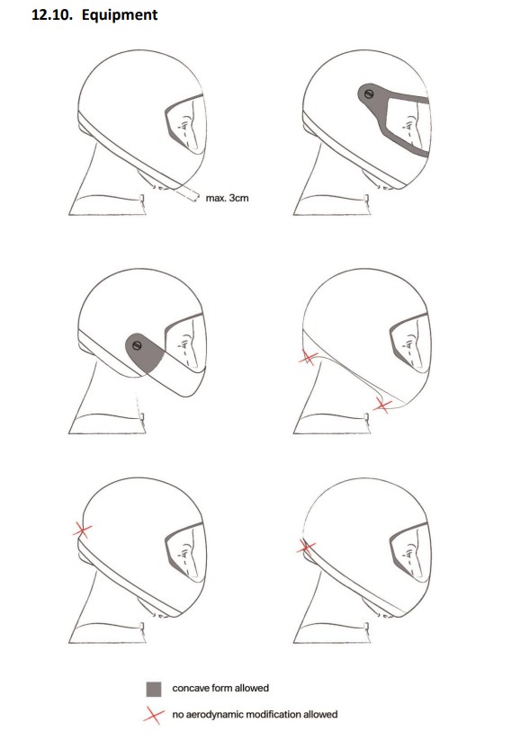 The chin guard, the visor and the hardware for attaching them are the only protruding elements allowed. These elements cannot, however, have aerodynamic coverings. For safety reasons, all helmets must have a smooth surface.