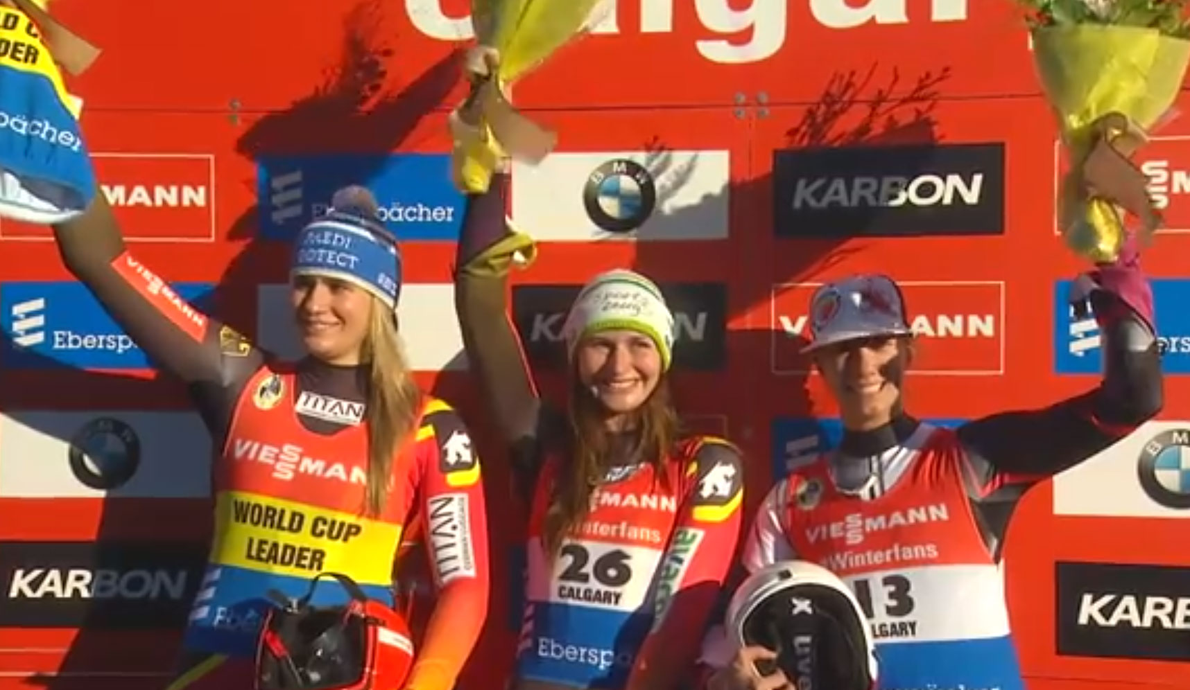 Geisenberger finished with a silver medal, just ahead of Canadian Kimberley McRae. McRae scored a bronze medal in her first race of the 2018/2019 season. The race in Calgary will be one of only a handful of races McRae will race in as she works to finish school.