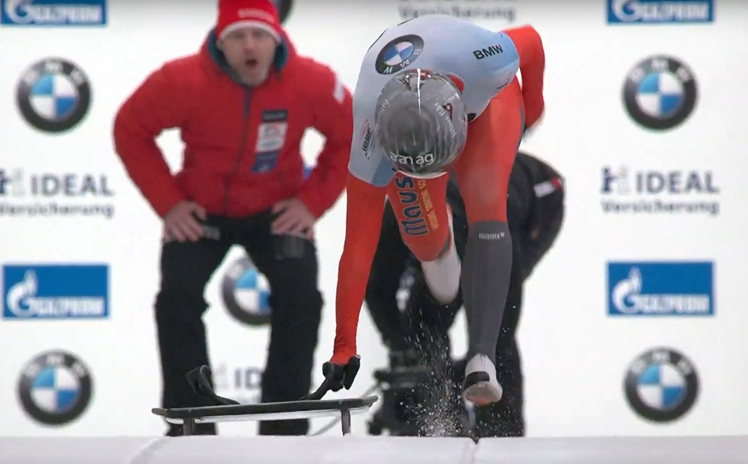 Alessia Crippa’s chinstrap came off in her hand while she was putting on her helmet at the start and was initially ruled as a “DNS” as she couldn’t get a replacement helmet in time. She was later allowed to go off last while wearing a loaner German helmet. Earlier in the week Laura Deas cracked her helmet in a training run and was also given a bright orange helmet by the Germans so she could continue racing in the World Championships.